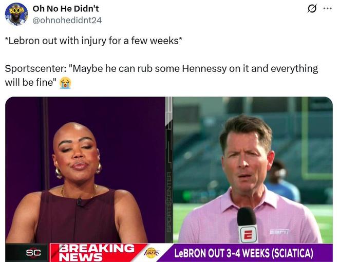 結(jié)果詹姆斯傷病恢復(fù)不理想狀況曝出后,不僅沒有獲得外界同情,反而遭到ESPN記者M(jìn)att Barrie的調(diào)侃。